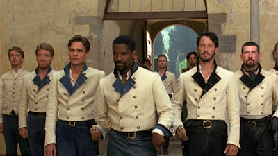 A peça em si enquadra-se nas ‘comédias de erros’ do cânone do Bardo. No geral é uma peça engraçada, ligeira e com ritmo, mas não deixa de ter alguns tons mais sombrios como catalisadores da história. Don Pedro (interpretado por Denzel Washington com postura mas com um brilho gozão no olhar) regressa vitorioso de uma guerra não especificada a Messina, para passar umas semanas de lazer na casa de Leonato. O seu séquito inclui Benedick (Branagh) um solteirão orgulhoso e com a língua afiada, o jovem Claudio (interpretado por Robert Sean Leonard, então famoso pelo seu papel em ‘Dead Poet Society’, 1989, e que agora pode ser visto na série Dr. House), e o seu meio-irmão, que acaba por ser o vilão da peça, interpretado por Keanu Reeves (consensualmente a pior performance do filme, muito rígida e sem sabor). A entrada triunfal em Messina entrecortada com a preparação da cidade para receber os heróis constitui uma das sequências de créditos mais espectaculares da história do cinema (nos anos 1990 a maior parte dos filme ainda tinha os créditos no início), onde não falta o brilhante tema de Patrick Doyle, virtuoso e melódico, cativante e heróico. Aliás, ao longo de todo o filme, desde o tema principal ao simples ‘underscoring’, Doyle contribui fortemente para o sucesso de cena após cena. Para mim, esta é a melhor banda sonora da sua carreira, e também uma das melhores que o cinema já conheceu. Sou dono de uma cópia original do cd desta banda sonora (que só consegui adquirir no estrangeiro) e confesso que é uma das que mais gosto de ouvir. Quer sozinhas quer no filme as músicas sustêm-se brilhantemente (para quem aprecia bandas sonoras instrumentais e sinfónicas, claro) e, mais importante que isso, conduzem emocionalmente o filme.