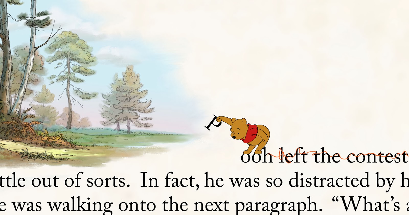 Depois, o filme propriamente dito começa. Narrado pelo glorioso John Cleese, com a sua mais bela pronuncia britânica, ‘Winnie the Pooh’ não só segue o formato visual que já se tornou norma nos filmes deste universo, como o extravasa, sem contudo se tornar exagerado. Ou seja, o narrador interage com as personagens, estas saltam (literalmente) para fora do livro, mas também no próprio livro, tropeçando nas letras (cujos trocadilhos que se formam também são usados para efeitos da história), trepando os parágrafos, virando as páginas, até que a câmara faz zoom numa imagem e a história prossegue no mundo mágico que estas personagens habitam. Este formato, que se tornou normal desde o filme de 1977, é reformulado de uma forma tão inventiva neste filme que quase parece original, o que proporciona uma acrescida dinâmica e um acrescido ritmo às transições de cena.