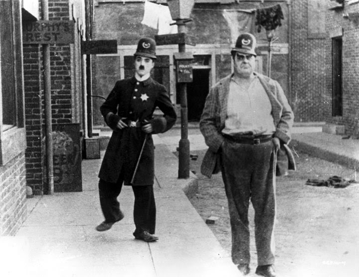 Corte para a Easy Street, uma clássica rua em T tão característica do cinema de Chaplin mas que neste caso de fácil ou de pacífica não tem nada. O gigantesco rufia interpretado por Eric Campbell (o habitual homem forte das curtas de Chaplin, e um humorístico contraponto para o pequeno e enfezado vagabundo), lidera uma épica luta no meio da rua entre os seus capangas e os agentes da Polícia. Estes acabam por levar por todos os lados e regressam à esquadra a cambalear ou de maca, completamente batidos. Algo tem de ser feito e a Polícia está a ficar sem recursos. Deambulando pela rua à procura de uma nova vida, Chaplin vê o sinal “Polícias precisam-se imediatamente”. Hesita à sua maneira particular mas acaba por entrar, e pouco depois, hilariantemente vestido num uniforme da Polícia dois tamanhos acima do seu, já está a patrulhar a batida que ninguém quer; precisamente a da Rua da Paz.