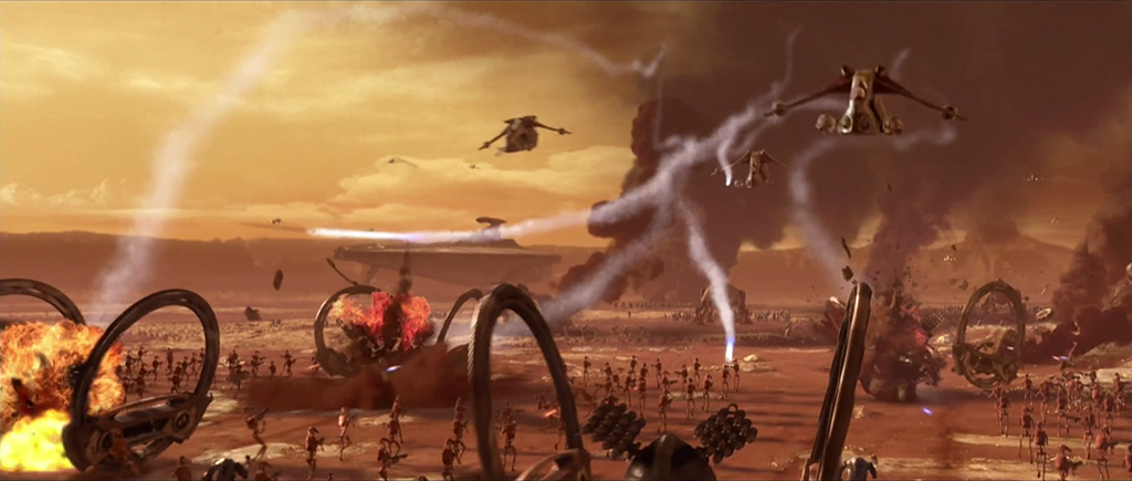 Isto é, se é que se pode chamar àquilo que se passa entre os dois um romance. O fantástico novo tema de John Williams (Across the Stars), e o facto de darem um beijo são as únicas indicações credíveis de que estas duas pessoas estão apaixonadas. Não será por nada do que dizem certamente. Este é um dos romances mais forçados e mais mal escritos da história do cinema, e a química entre Natalie Portman e Christensen é absolutamente inexistente. Emocionalmente, a sua relação não é nada mais que uma mistelada pastosa, forçada e incoerente, pior do que aquela que se vê em inúmeras novelas na TV. Continuo sem perceber como é que Padmé gosta de Anakin se tudo o que ele faz neste filme é amuar, queixar-se e ter atitudes egoístas. É por as mulheres gostarem de bad boys? É uma atracção física? Só pode. Padmé conheceu um miúdo de 10 anos em Ep. I. Não se apaixonou por ele aí certamente. Mas depois conheceu um tipo de 20 anos completamente mimado e que não tem um único gesto de afecto a não ser dizer umas baboseiras telenovelescas. Nem a mim nem a ninguém estas cenas convencem e só se salvam por serem as únicas filmadas em cenário real (nos lagos italianos), o que ao menos é um alívio depois de uma hora de CGI. Em Tatooine apenas o destaque para o ataque de Anakin aos Tusken Raiders, como um momento chave da sua viragem para o lado negro. Resulta, mas só porque ele não abre a boca. Esta é a triste verdade deste filme.